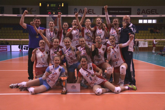 02.05.2015 | Několikaletý sen mládežnických volejbalistek Prostějova věkové kategorie do 17 let o dobytí mistrovského trůnu se stal skutečností! Agelky po semifinálovém skolení Španielky Řepy hrály stejně skvěle i ve finále extraligy kadetek ČR 2014/15 proti Olympu Praha a byť ztrátou třetího setu trochu znejistěly, nakonec do zlatého přístavu bezpečně dopluly. Slastné pocity republikového triumfu si navíc mohly vychutnat v domácím prostředí prostějovské haly Sportcentra DDM, kde na položeném taraflexu převzaly nejcennější medaile i trofej pro vítězky soutěže. Stříbro bral PVK a bronz vydřely České Budějovice.